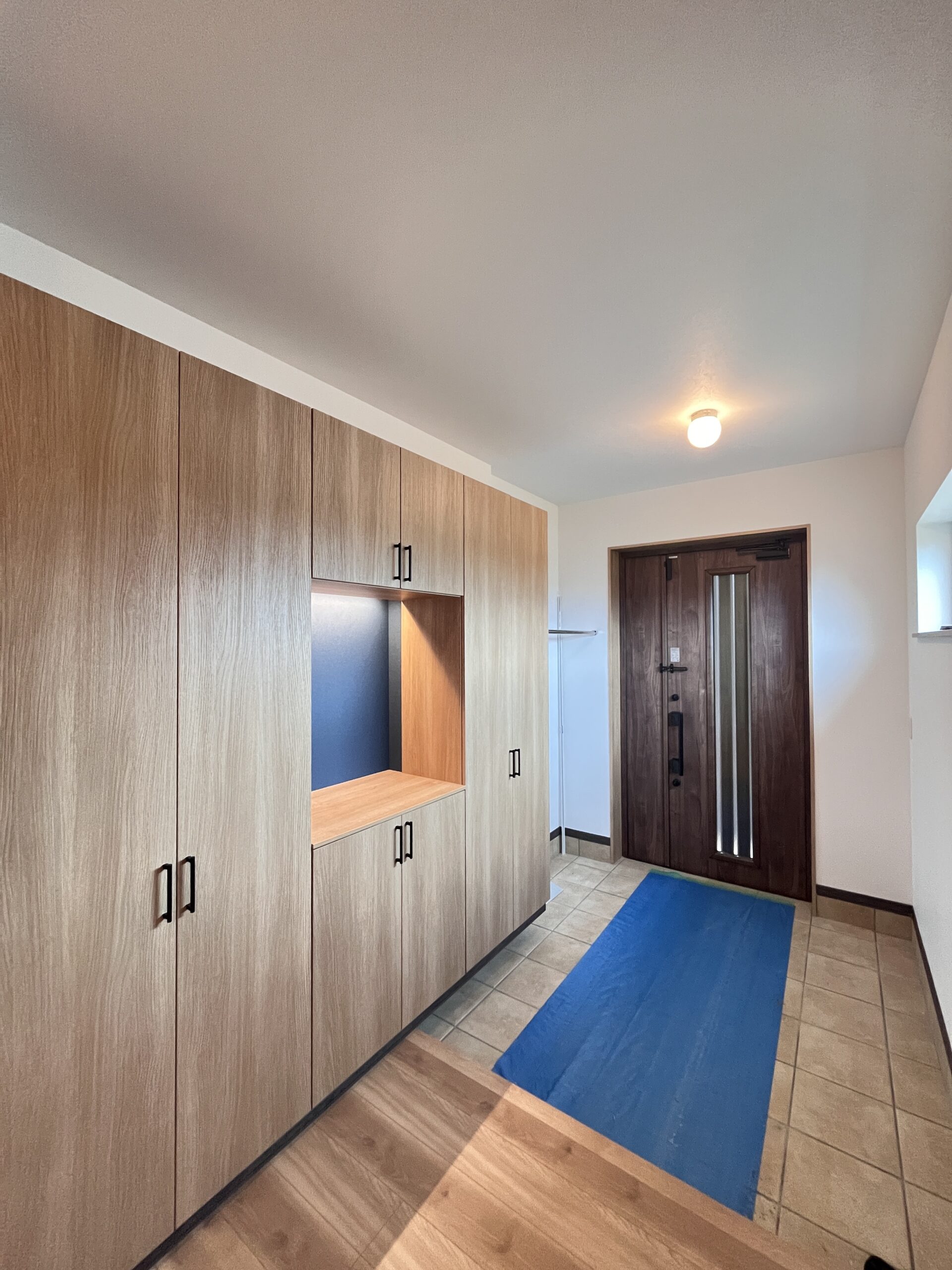 大容量のロの字型シューズ収納と間接照明が、上質な雰囲気で家族と来客を迎えます。