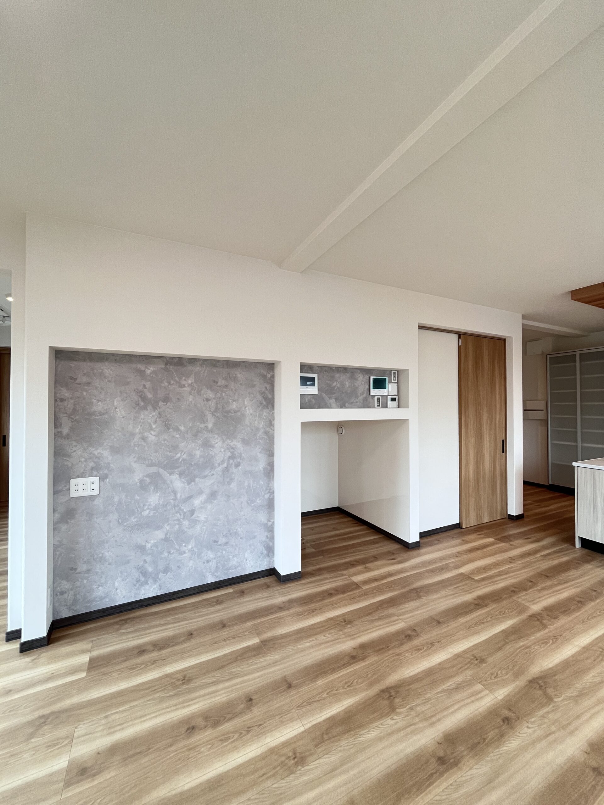 壁掛けテレビ用の壁は、配線をすっきりと収められるよう、ニッチ形状に仕上げています。